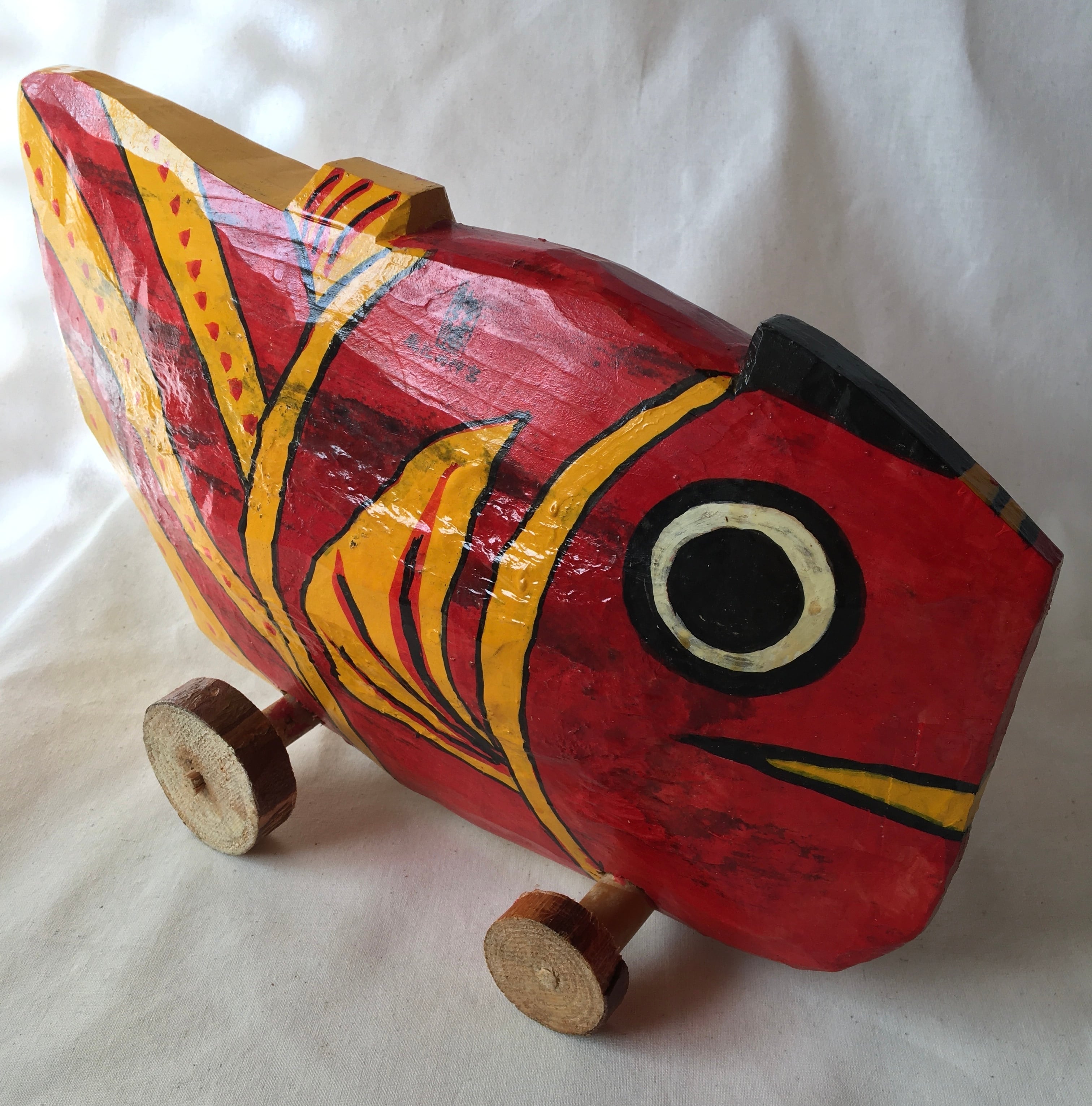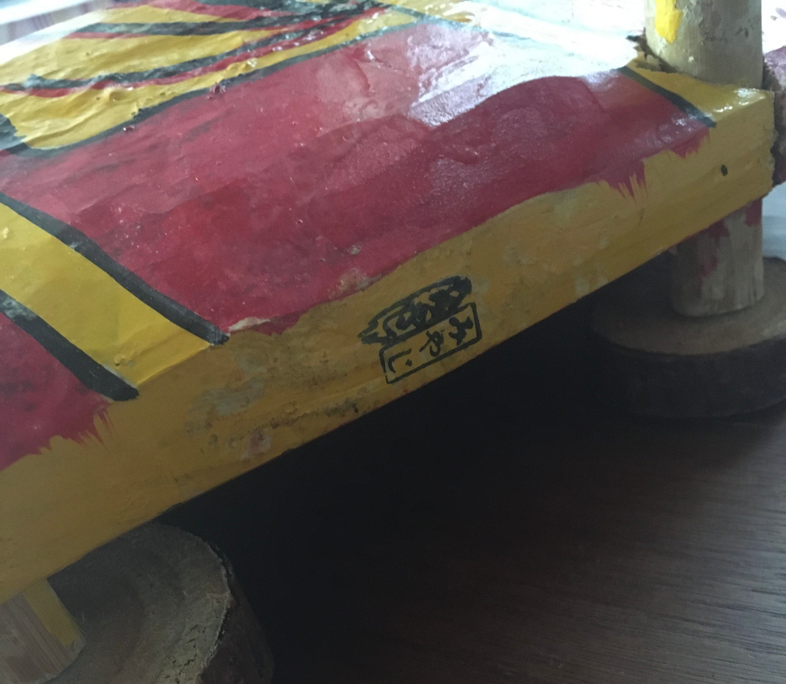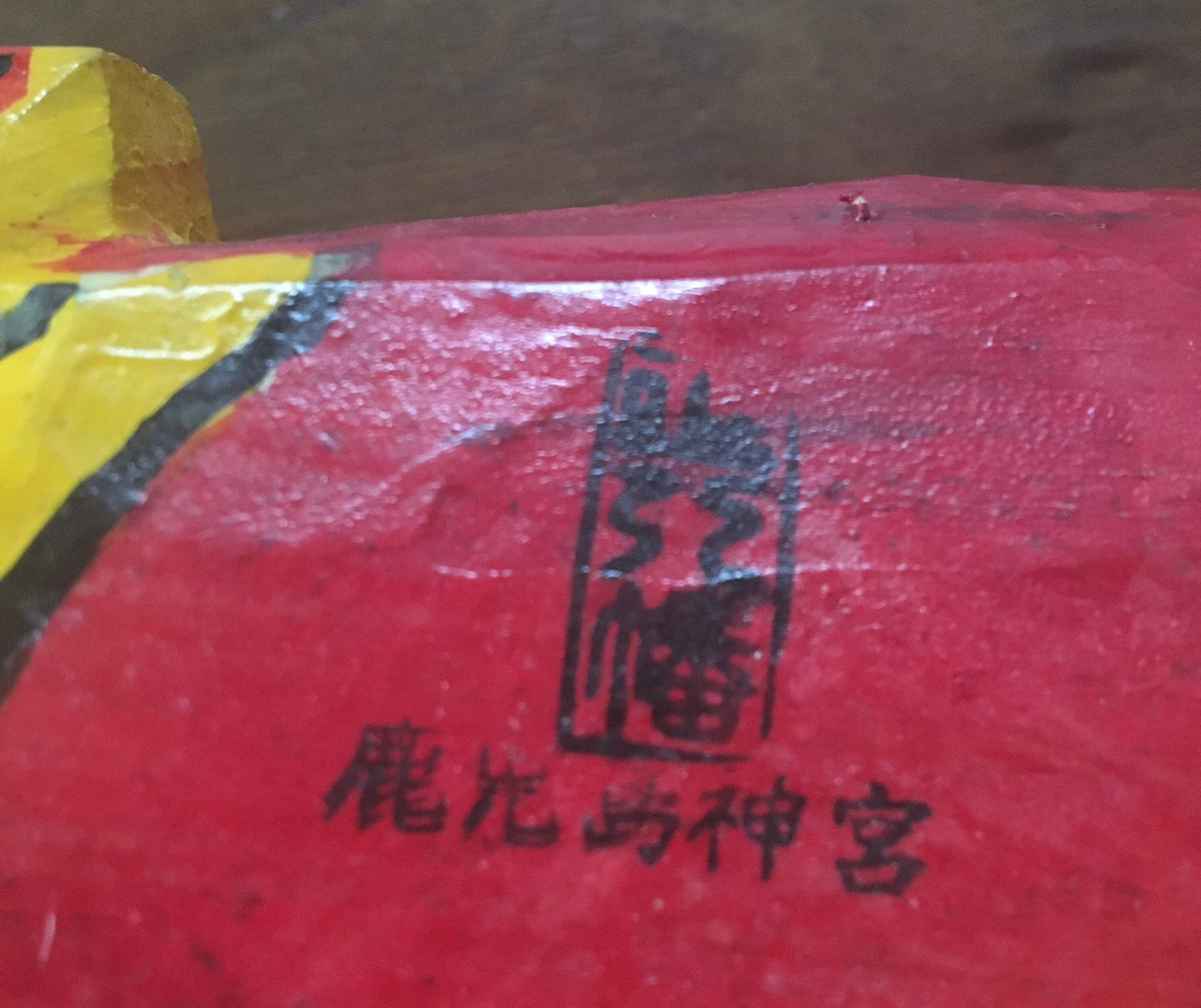 丸くぐりぐりとした大きな目に、赤と黄色の彩色が愛嬌ある木彫の郷土玩具で、鹿児島神宮で授与されていたものです。