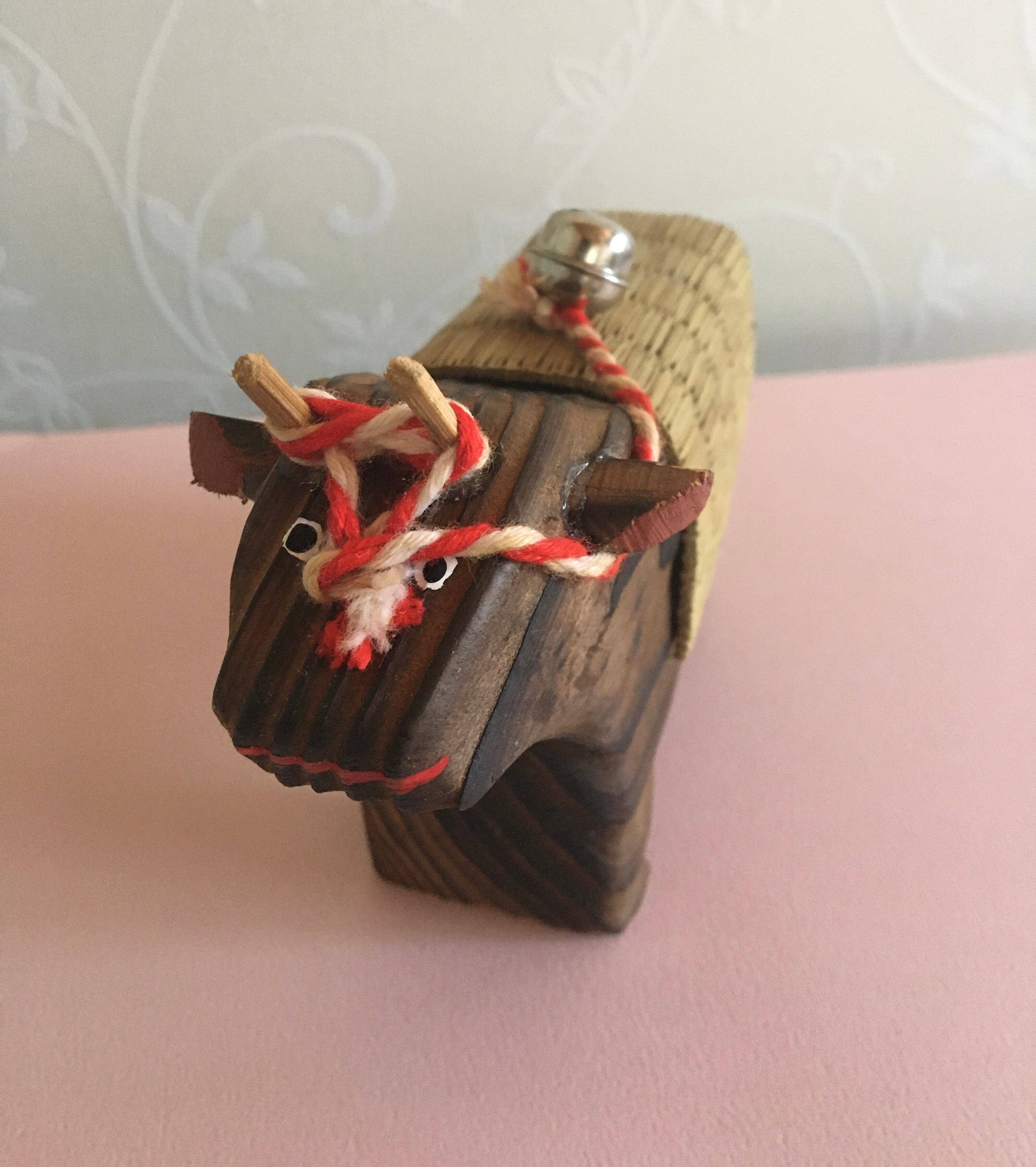 鈴付きの紅白の手綱をした牛の一刀彫です。