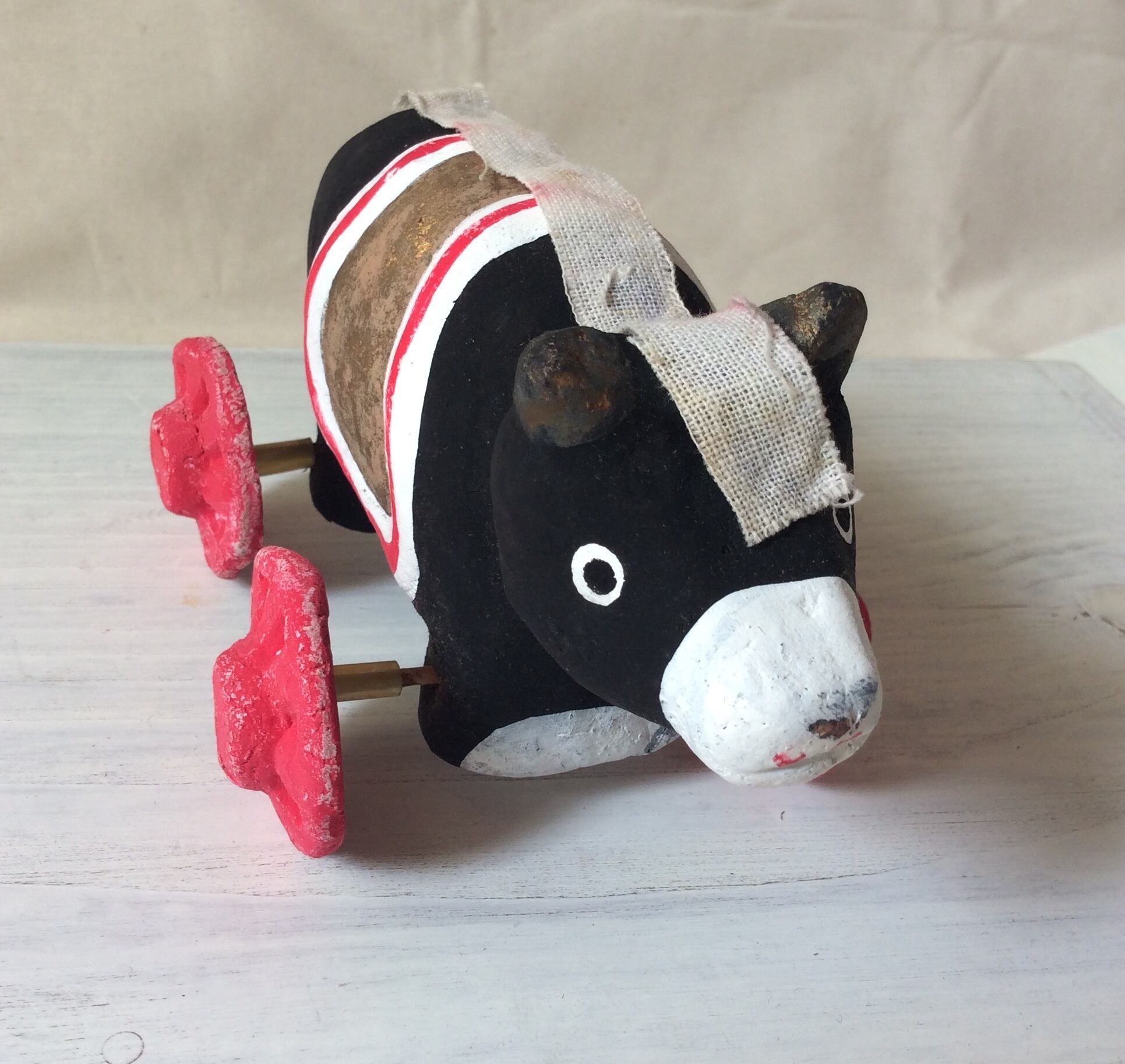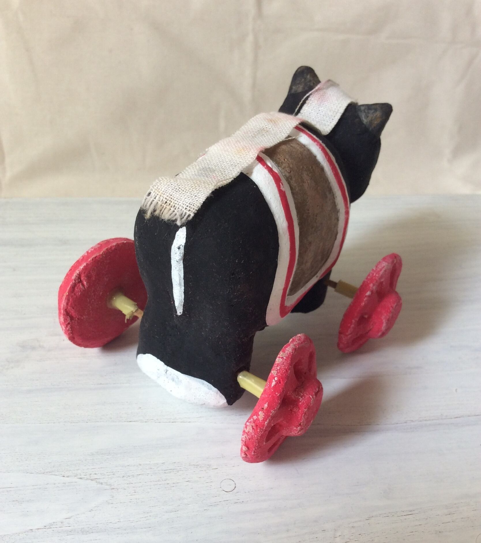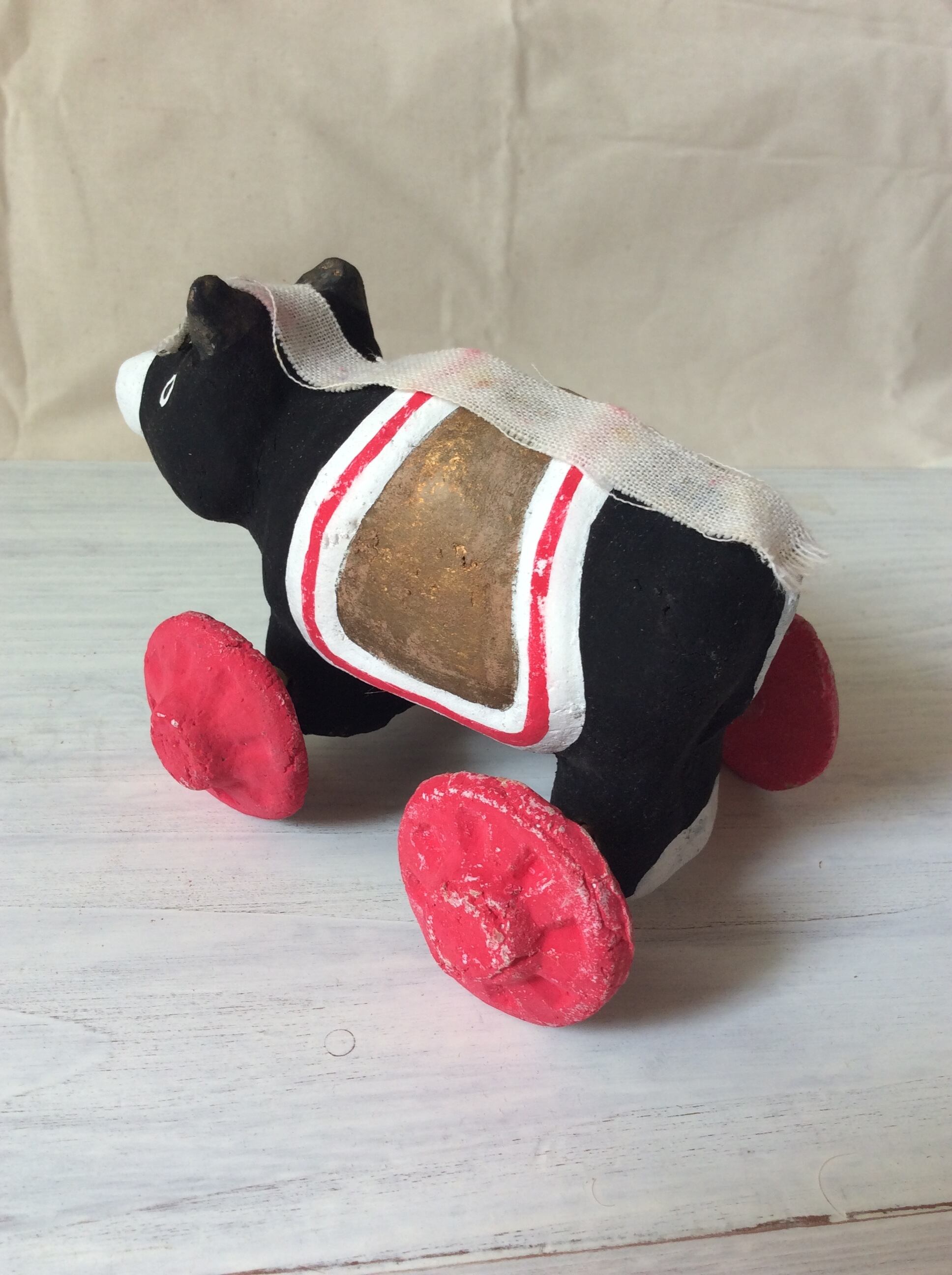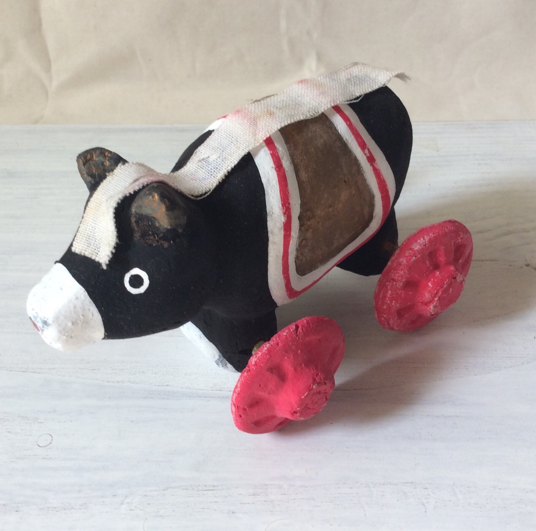 「牛に引かれて善光寺参り」の故事をモチーフにした牛の土人形で、車輪がついていてコロコロと動きます。箱に入ったまま未使用ですが、経年のため布がやや古い印象です。