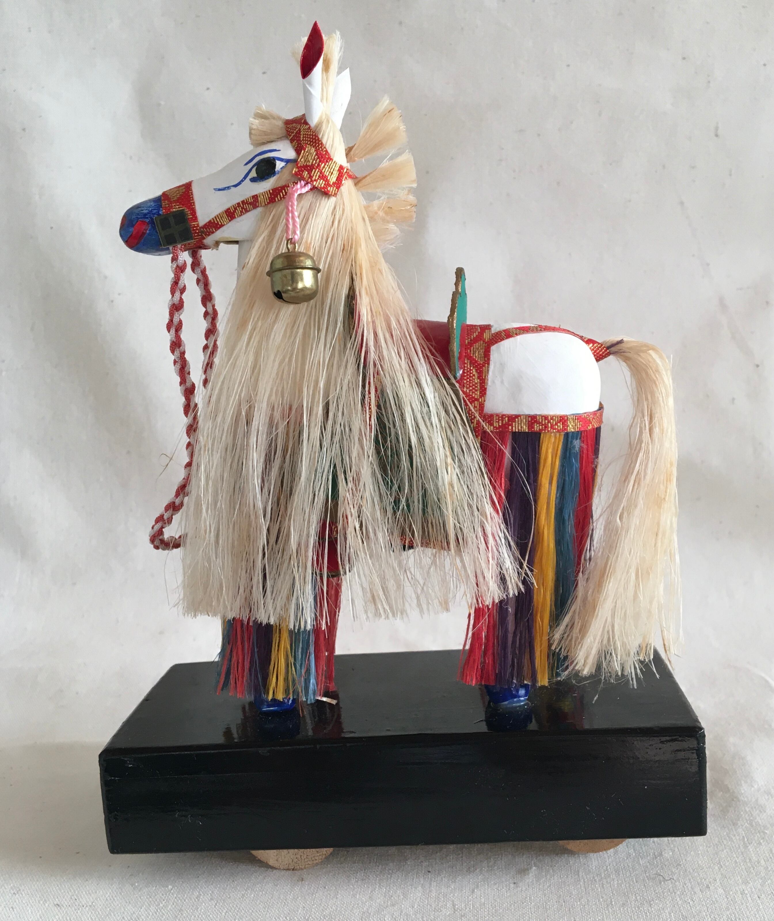 車輪つきの張り子の飾り馬です。黒い木箱の中に車輪がついていて、動かすと白馬の首が前後に動く仕掛けです。