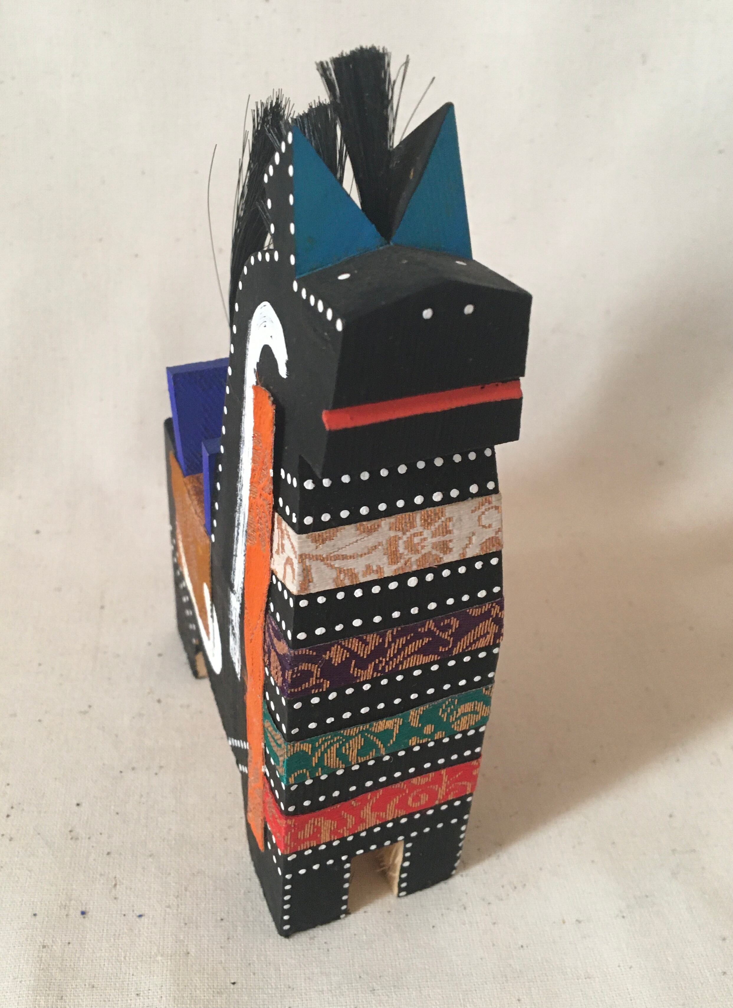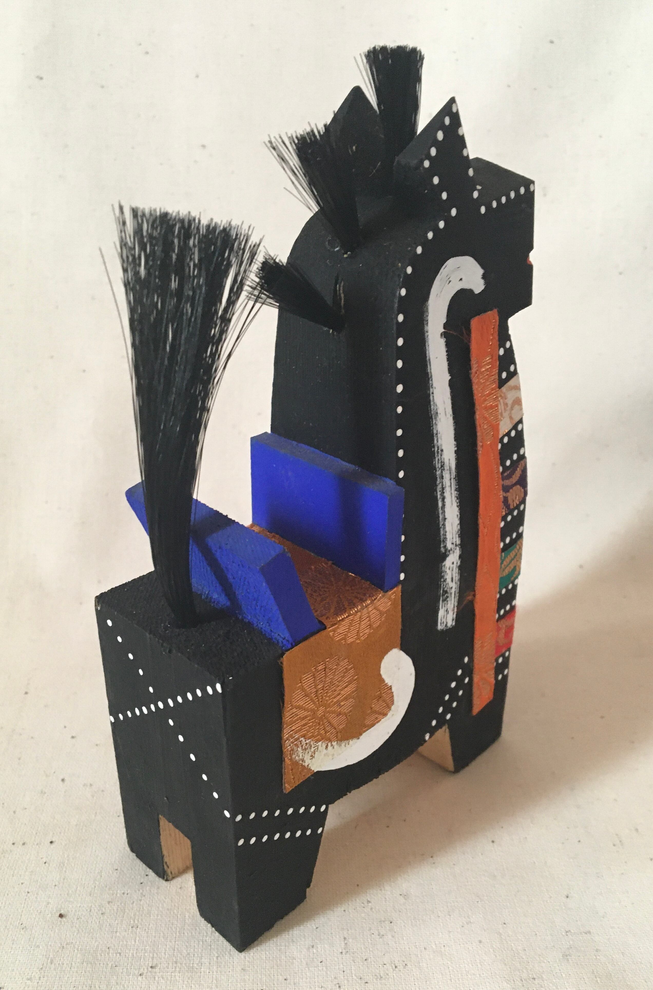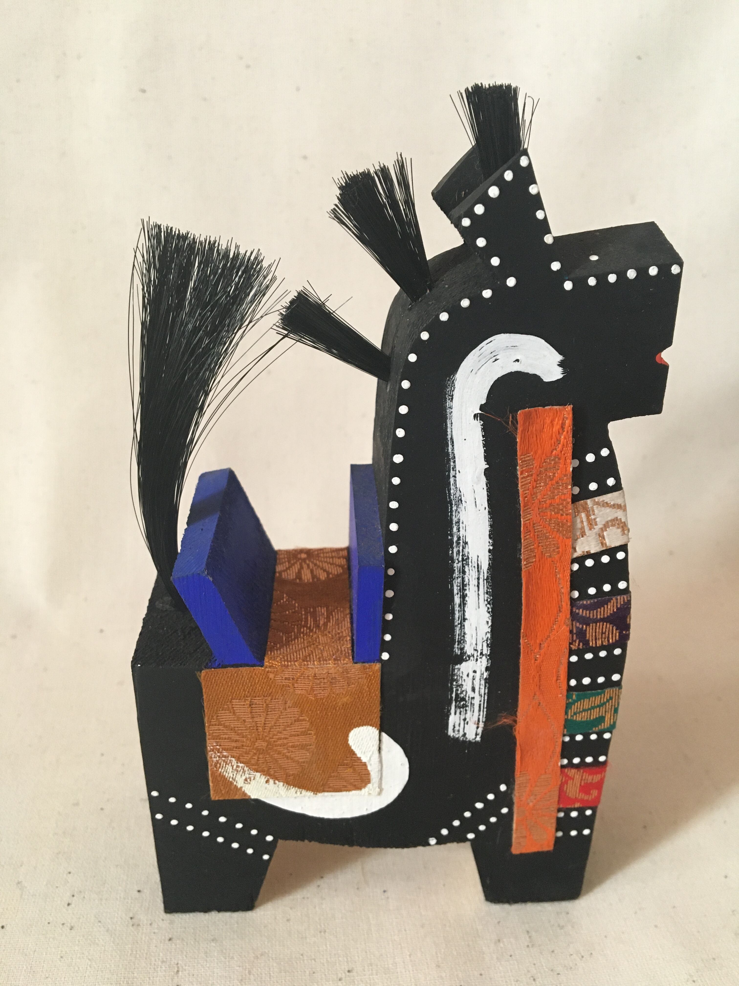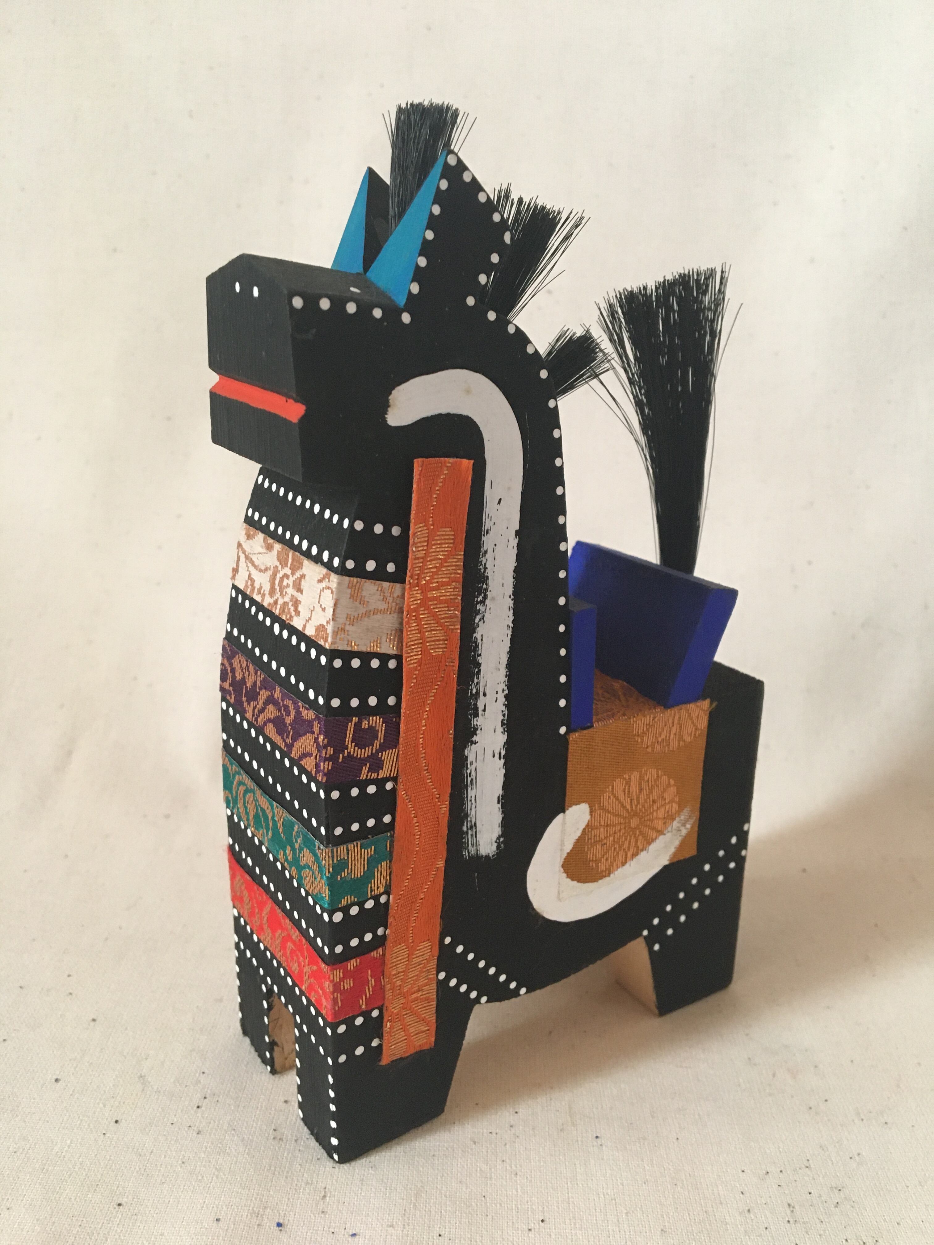 彩色はエナメルではなく、昔ながらの墨塗りで、コバルトブルーの耳やエンジの口など色使いはモダンな印象です。装飾は織物が貼られ、白い水玉模様はとても丁寧に描かれています。馬首が長くスマートな馬体はペルシャ駒を受け継いでいるそうです。