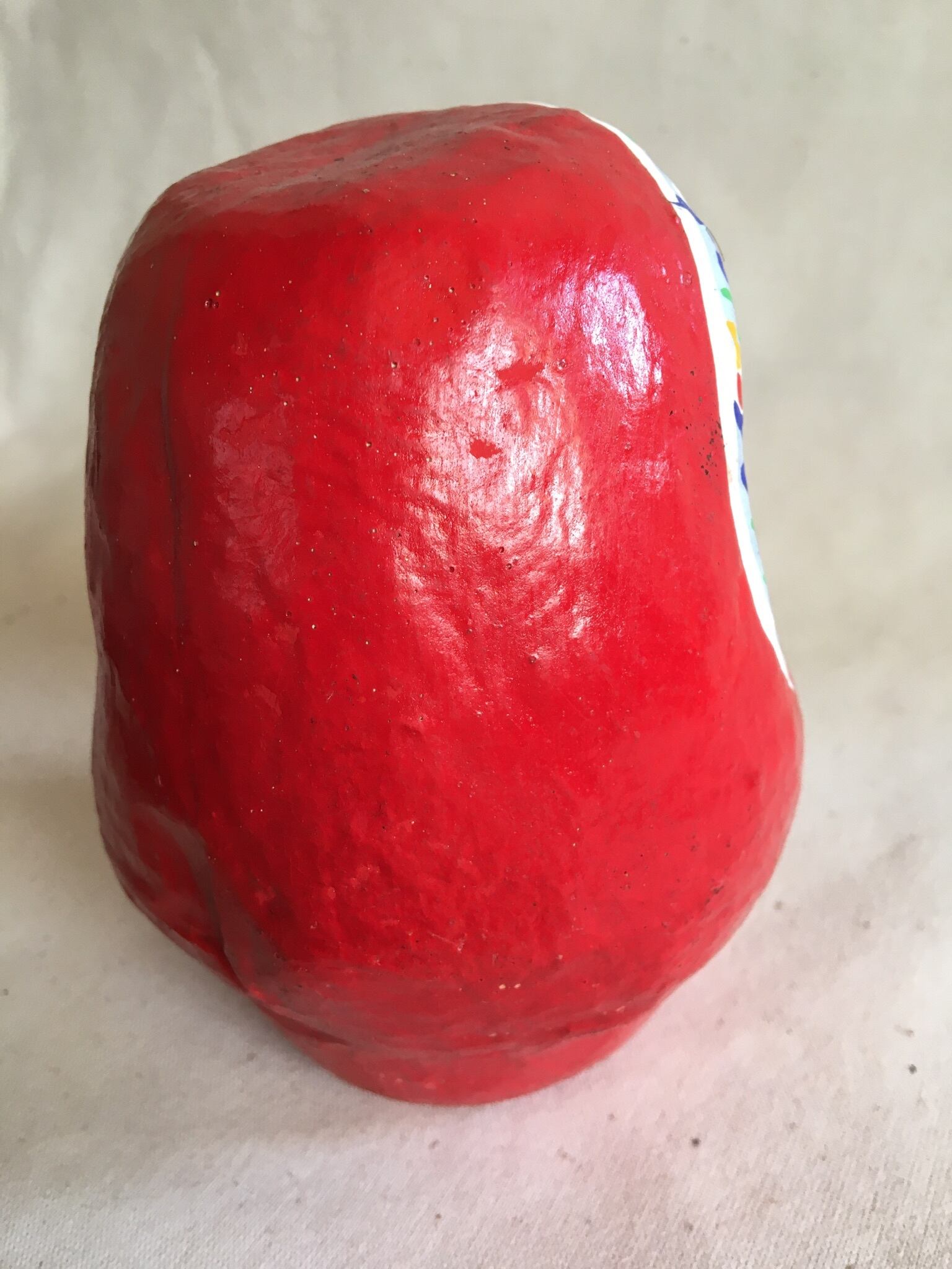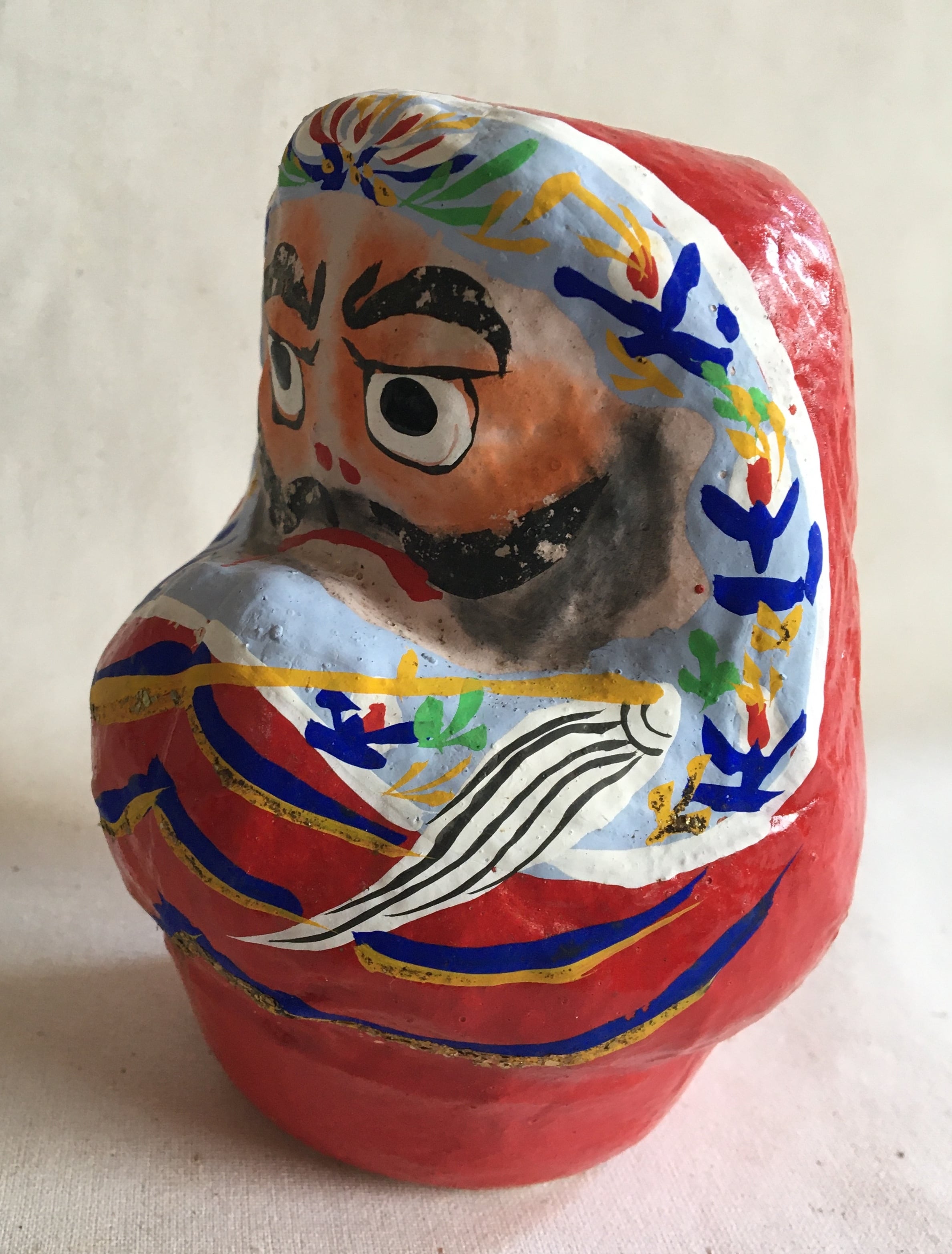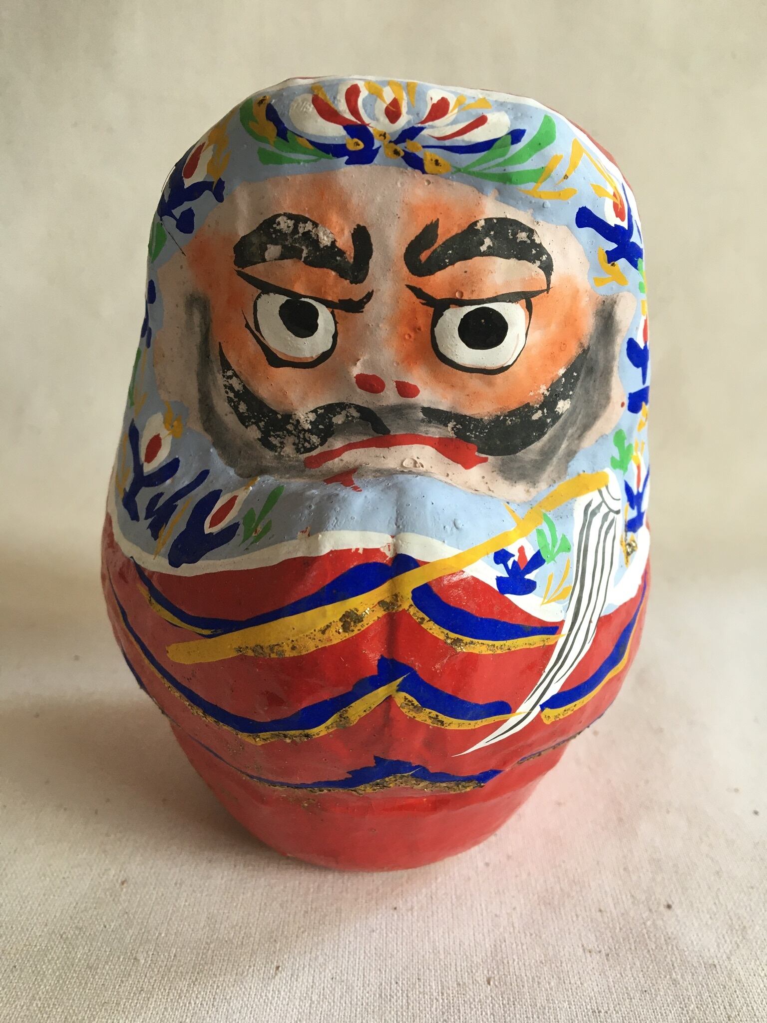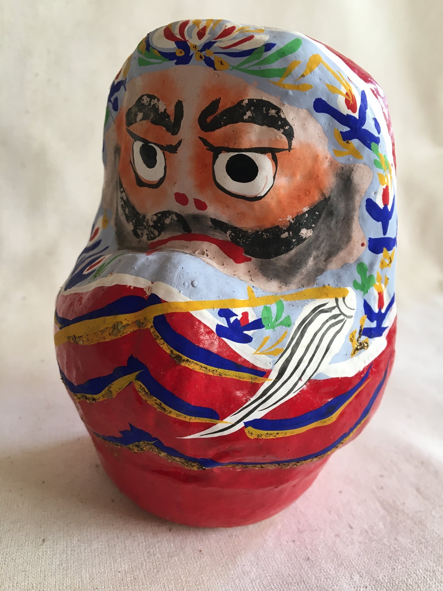 仙台張子の火伏だるまです。横向きが特徴的なだるまさんです。合掌した手を衣の下に隠しているので横から見て盛り上がっており、顔には煤の汚れが表現されています。火伏せの護符として知られているだるまです。