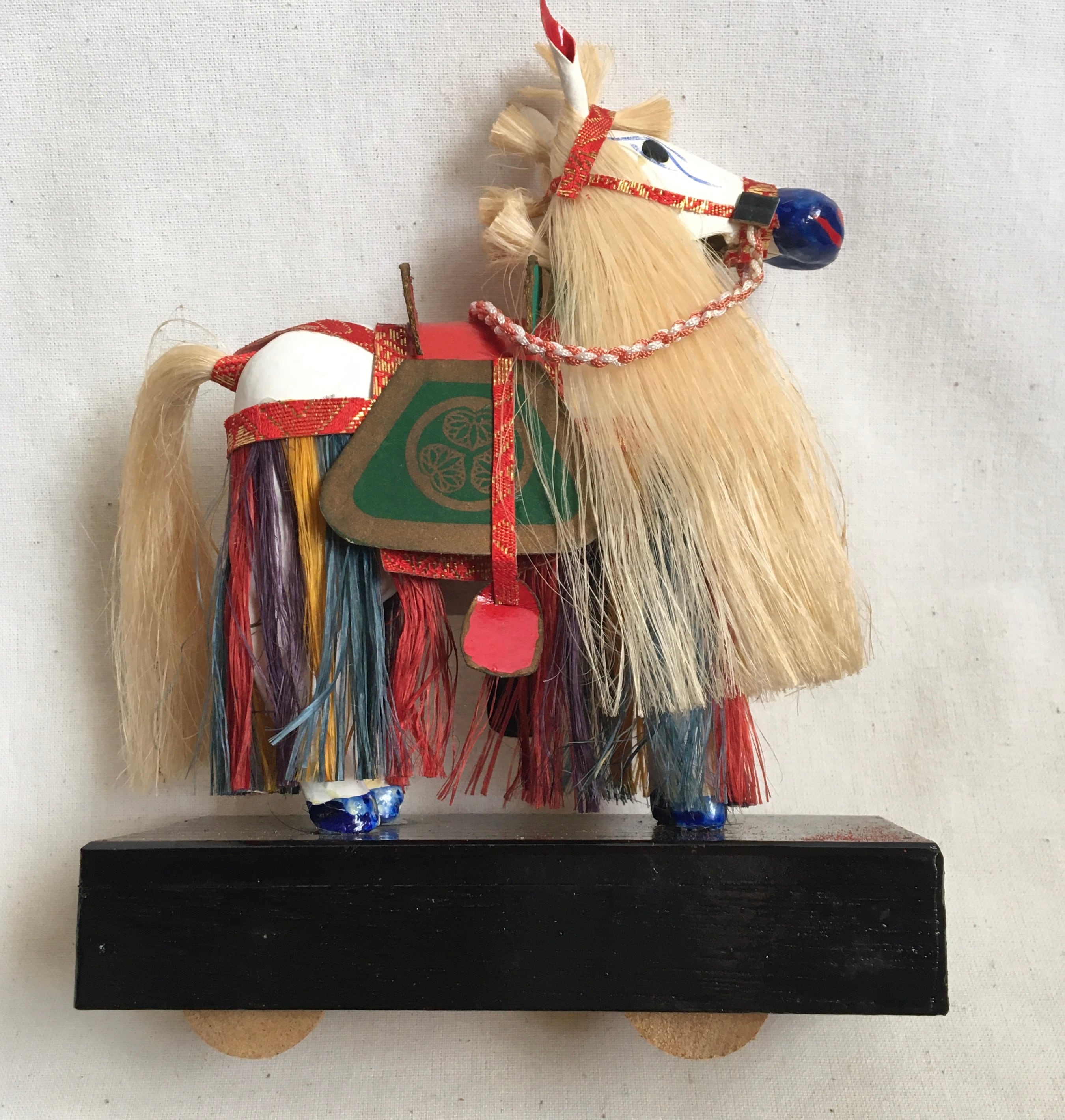 車輪つきの飾り馬の張子です。黒い木箱の中に車輪がついていて、動かすと白馬の首が前後に動く仕掛けです。